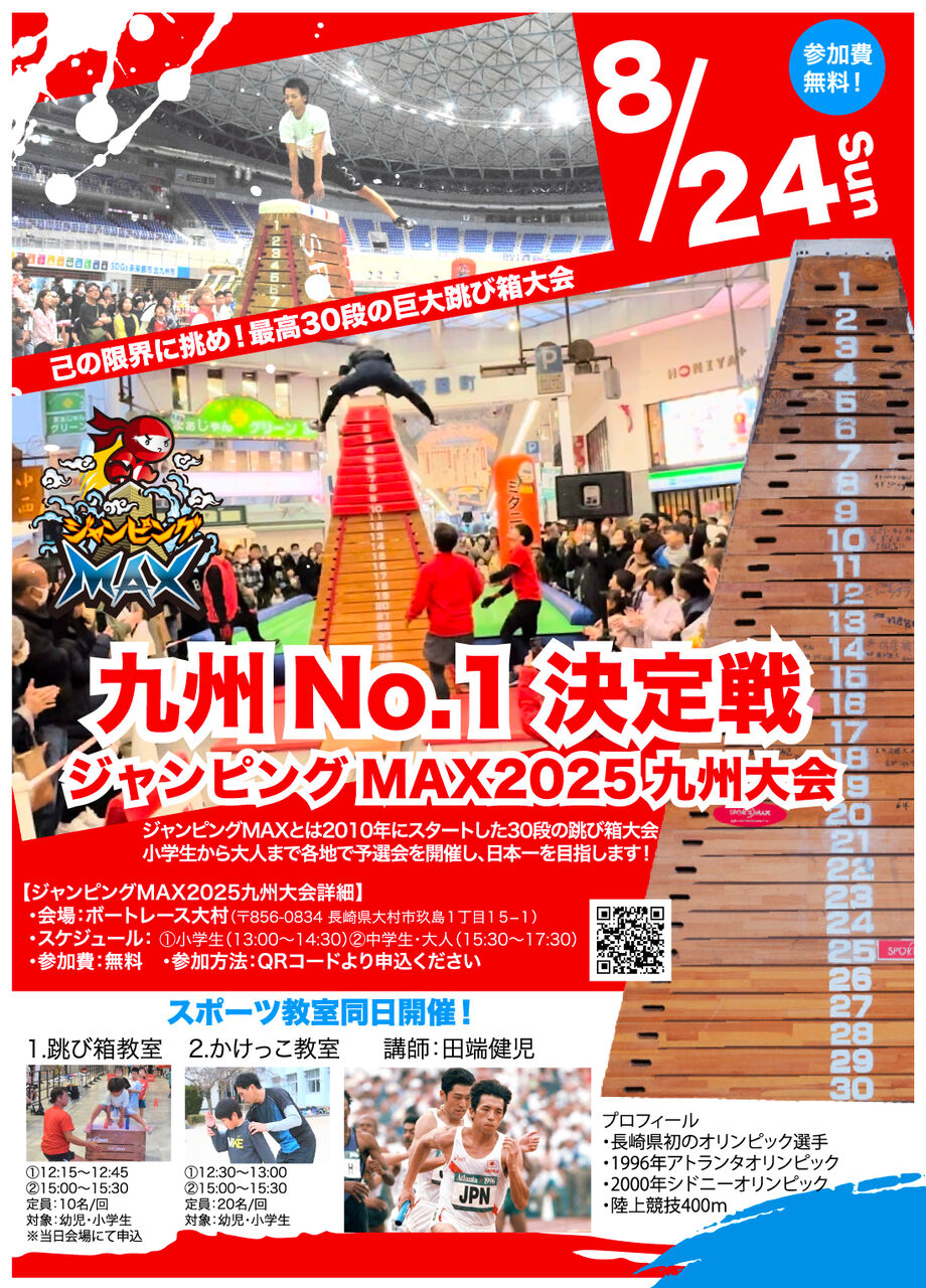 ジャンピングMAX九州大会会場にて、跳び箱教室とかけっこ教室を開催します。 8月24日(日)に開催します「ジャンピングMAX2025九州大会」会場にて、···